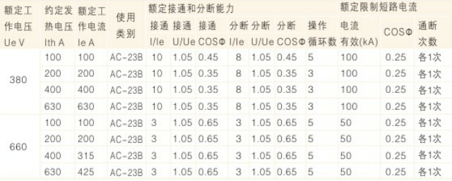 6.開關的電壽命分別為600次(100A、200A)和200次(400A、630A)接通與分斷條件按(表2)。