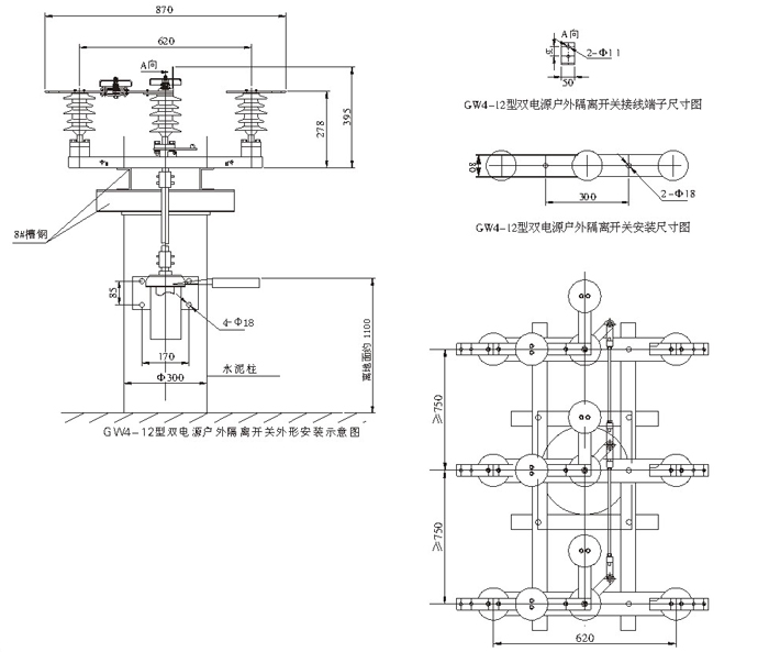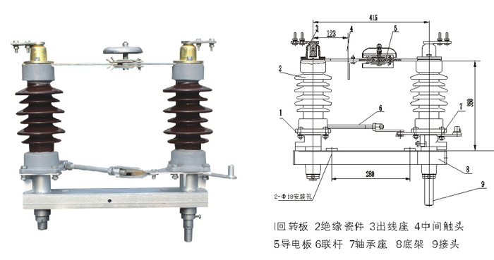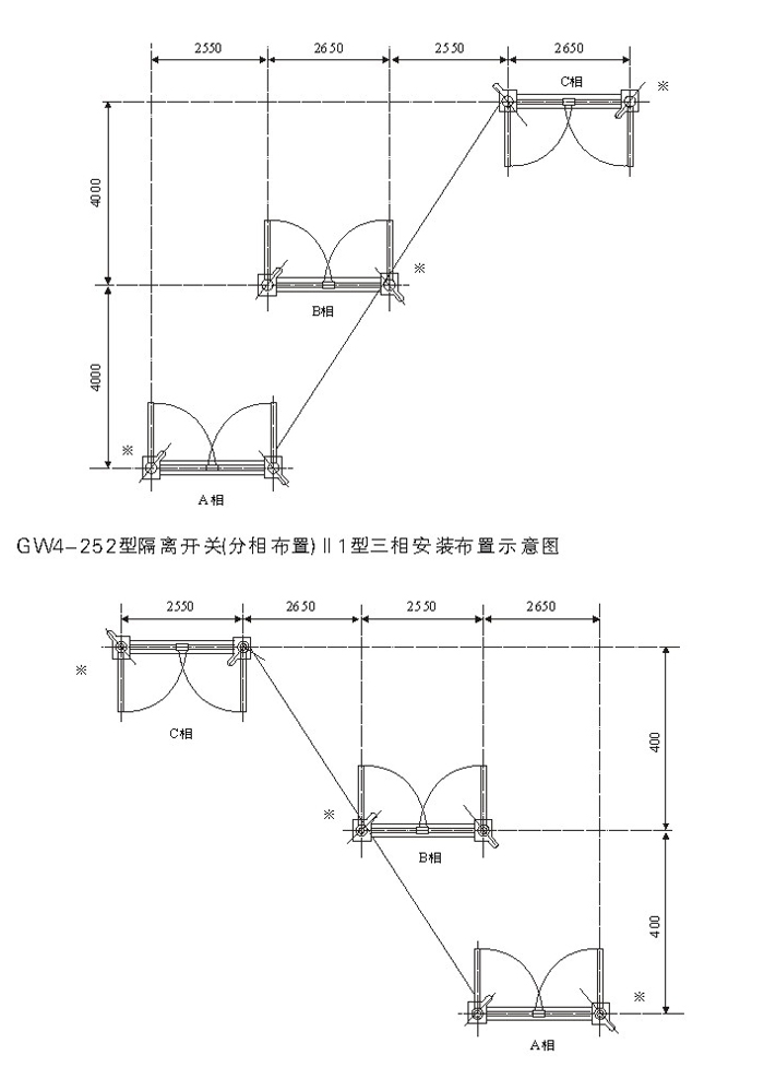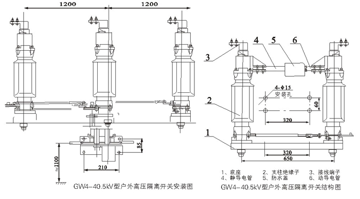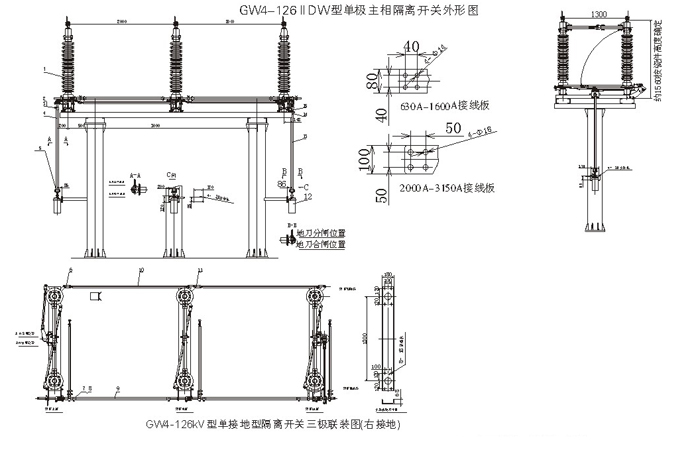 1)35kV成套隔離開關(guān)由GW4-40.5(D)(W)型隔離開關(guān)本體、CSⅡ、CS17或CS8-6D型人力操動機構(gòu)、傳動附件等組成,也可配用CJ6型等電動機構(gòu)。110kV成套隔離開關(guān)由GW4-126(D)(W)型隔離開關(guān)本體、CS14G人力操動機構(gòu)、傳動附件等組成,也可配用CJ6型等電動機構(gòu)。 2) 該隔離開關(guān)屬雙柱水平開啟式隔離開關(guān)。制成單極型式,當(dāng)三極同步使用時,極間用連接桿連接起來。各單級都由基座、支柱絕緣子、出線座及觸頭等部分組成,兩支柱絕緣瓷瓶相互平行地安裝在基座兩端地軸承上,且與基座垂直。主導(dǎo)電部分分別安裝在兩支柱絕緣瓷瓶上方,隨支柱絕緣瓷瓶作約90°轉(zhuǎn)動。 3)隔離開關(guān)的每個軸承座內(nèi)裝有軸裝配,兩軸裝配間通過連扳、調(diào)節(jié)螺桿等連接傳動。 4)出線座中的紫銅編織帶軟連接分別緊固在導(dǎo)電桿和接線板上,接線板供用戶連接路之用。 5)中間觸頭部分的觸指稱為裝配,采用外壓式或自力型觸指,其形式為轉(zhuǎn)入式,以減少分、合閘時觸頭與觸指間的磨損,提高使用壽命。 6)隔離開關(guān)附有接地開關(guān)時,主導(dǎo)電回路與接地開關(guān)的聯(lián)鎖用基座上的扇形板與弧形板保證,在 主導(dǎo)電回路合閘時,接地開關(guān)不可合閘,接地開關(guān)合閘時,主導(dǎo)電回路不可合閘。配用CS8-6D或CS17-Ⅱ型時隔離開關(guān)與接地開關(guān)聯(lián)鎖由機構(gòu)上的連鎖板實現(xiàn)。 |