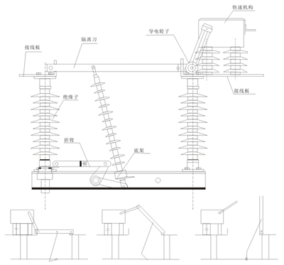 滅弧室裝于進線端的靜觸頭上,在合閘位置時與主導電回路——靜觸頭并聯(lián),這樣保證開關(guān)具有很強的過載承受能力以及可靠的導電性(此時相當于一臺關(guān)合的隔離開關(guān))。隔離斷口用隔離刀相連。帶動滅弧室動作的是一快速機構(gòu),由隔離刀動作帶動快速機構(gòu)上的導電叉子為快速機構(gòu)儲能,導電叉子也在關(guān)合與開斷的瞬態(tài)過程中起導通電流作用。為了使隔離刀也能快速動作,在操作隔離刀的三軸上設(shè)有一過中彈簧,保證隔離刀在開斷和關(guān)合過程中轉(zhuǎn)到一定角度能快速動作。
