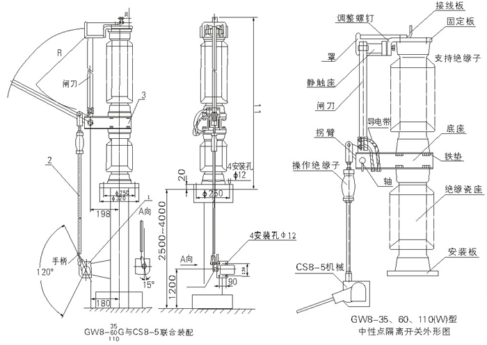 中性點隔離開關主要由隔離開關,主題連桿系統,操作機構組成。本體有觸頭裝配,棒式支柱絕緣子,導電桿裝配,安裝板等裝配組成。連桿系統由接頭和連桿組成。 操動機構書粗話軸可作120°水平旋轉,通過連桿系統及轉臂轉轉動觸觸頭合閘或分閘。處于合閘或分閘位置時,由操作機構上的定位裝置保證觸頭與靜觸頭處于正確的合閘位置成分閘位置。 |