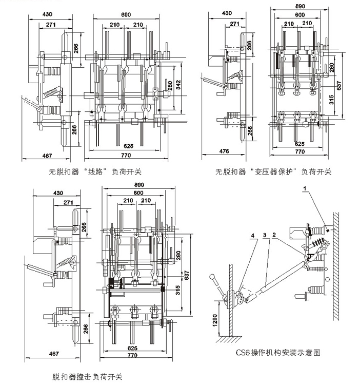 負荷開關由底座、絕緣子、動、靜觸刀、滅弧刀、弧觸頭及滅弧室,傳動機構及彈簧儲能機構,熔斷器與CS6或園盤操作機構等組成,可與接地開關連體,并具有聯鎖裝置。