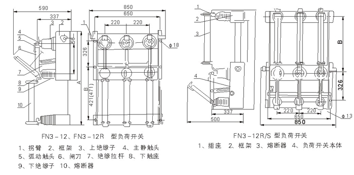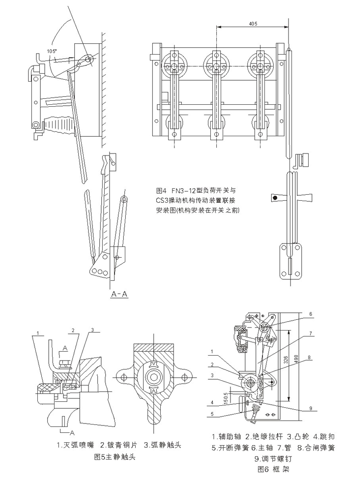 | FN3-10型戶內負荷開關的外形與一般戶內隔離開關相似(圖1)開關的底部為框架2,傳動機構裝于其中。框架上裝有六只絕緣子,上部的三只絕緣子3兼作支持件與氣缸之用,活塞裝于其內,由主軸帶動,下部的三只絕緣子僅起支持作用。上、下絕緣子上均裝有觸座。導電部分由閘刀與觸座組成,閘刀6與下觸座8之間靠六片形彈簧片因緊,在閘刀的端部裝有弧動觸頭5,上觸座4為主靜觸頭。 | ||||||||||||||||||||||||||||||||||||||||||||||||